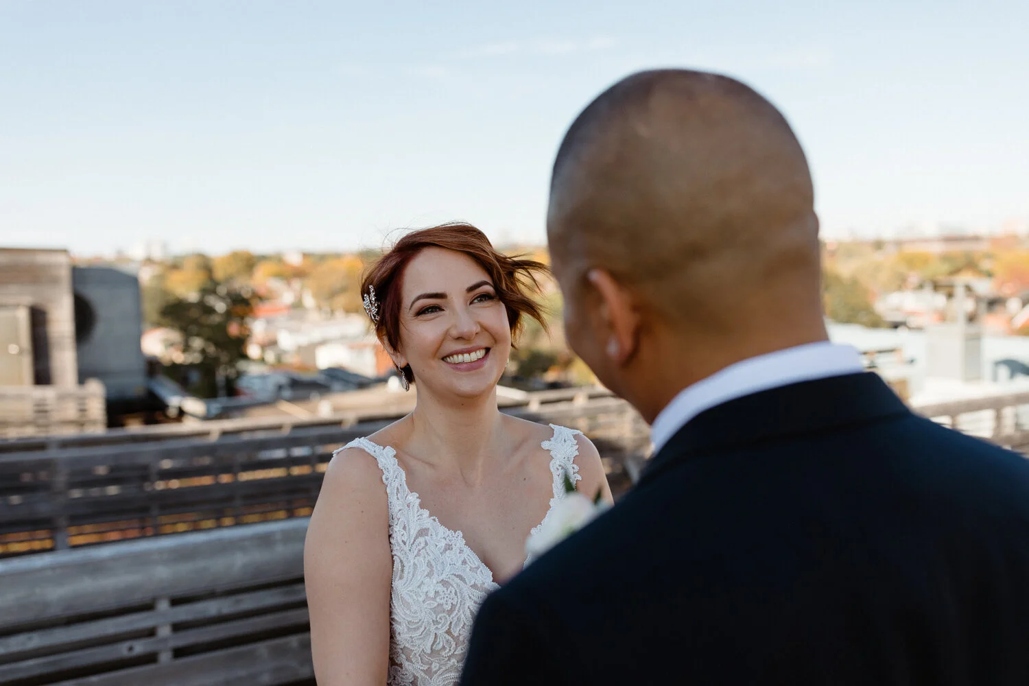 Nicole got ready in the bridal suite with the help of her mother and Darryl’s daughter who did her hair to complete her stunning modern-vintage bridal look. Ryanne and I actually first met Nicole at the Wedding Co. Market at Wychood barns earlier in the year and I distinctly remember how genuinely down to earth and nice she was. That same calmness was present on the wedding day as she made her way to the Gladstone’s rooftop suit to surprise Darryl for their first look.