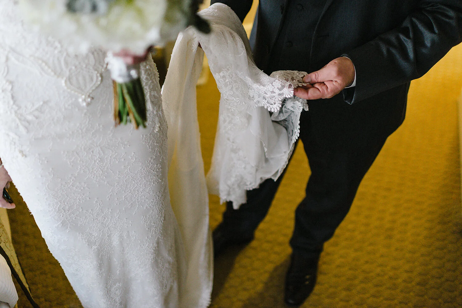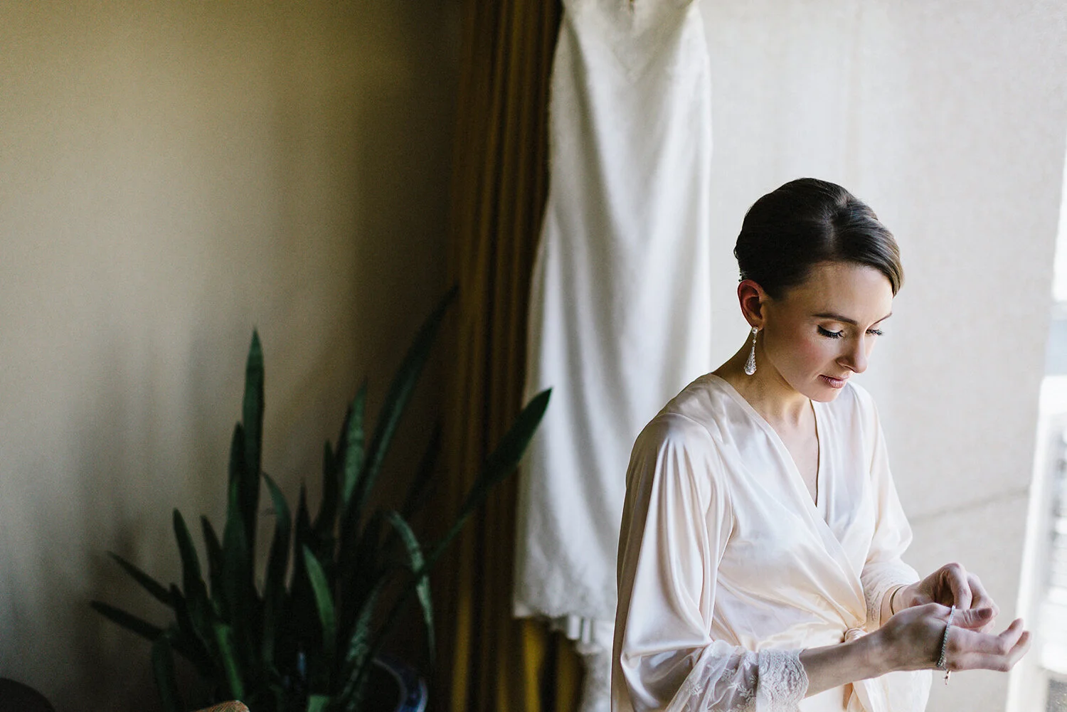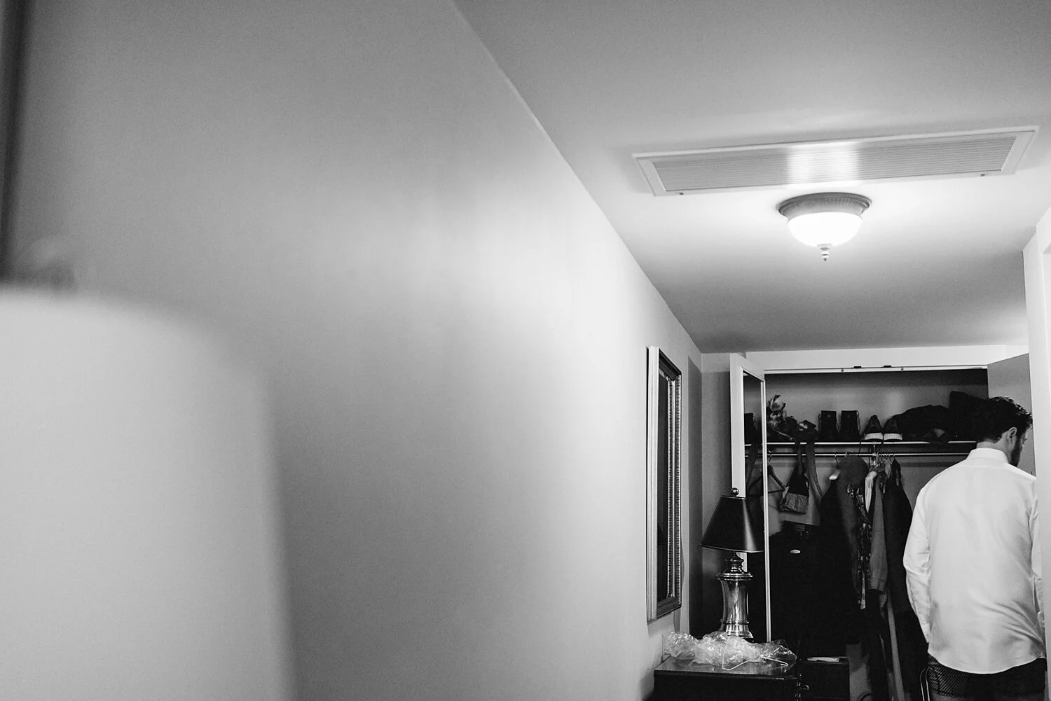 Since the Bride works for Prada, I had no doubt that she would have one of the most memorable wedding looks I would get to photograph as a wedding photographer, and Aubrey did not disappoint, looking completely stunning in her fashion-forward and timeless look. While the bride got ready in her hotel suite, the groom was literally next door in a separate, but attached, suite getting ready with his best pals and soaking in the moment. There was something incredibly unique and special about their getting ready. Although I appreciated the convenience of just walking through a door to jump back and forth between the bride and groom for photographs, the anxiety and nervous energy emitted through the very walls separating them which created a beautiful and honest ambiance to the getting ready that is often rare in these circumstances. During their first look they held hands through a small crack in the door, listening to each other’s breaths until the anticipation overtook them before embracing in a quiet moment.