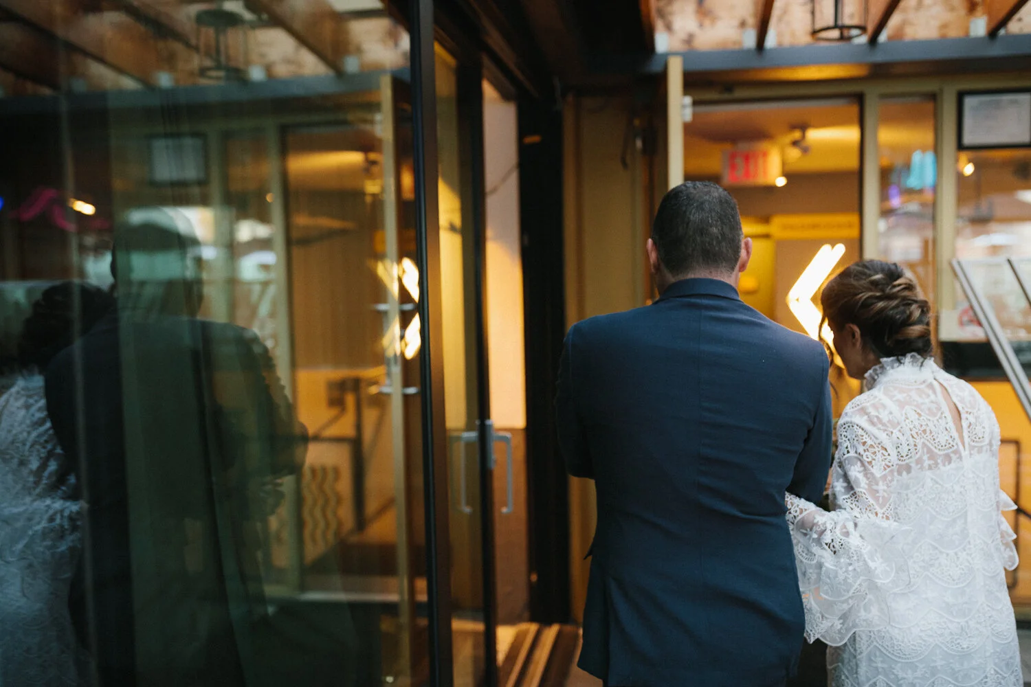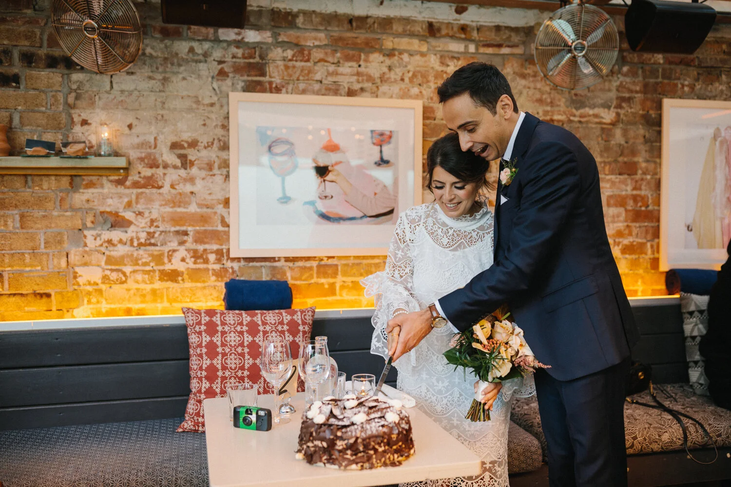 As the ceremony wrapped up the bride and groom enjoyed a toast with their guests and cut their cake before escaping and enjoying the sights and sounds of the golden hour sunset peaking through the alleyways and bustling downtown of Queen Street West. It was such a calming and fun experience to walk the streets with Christophe and Sahar, getting to know them and their personal love story. It’s funny how small things can bring back big memories and the groom felt some serious nostalgia when we stopped at at yellow brick wall to take a few wedding photos, telling us how it reminded him of an exact location in Italy where he’s taken photos of Sahar during one of their travel adventures together. As we strolled through the alleyways an idea spurred into my head and I felt like it was my duty to create a situation for the bride and groom to share in a quiet and traditional moment together, so I brought us back to the now empty Artist Loft and played some music on a speaker and let the bride and groom enjoy an intimate moment together and share in a first dance. There was something really special about watching the bride and groom be carefree and share in some laughs and hugs, it was obvious in that moment that they were in their own world together, embracing the moment and really appreciating their elopement experience.