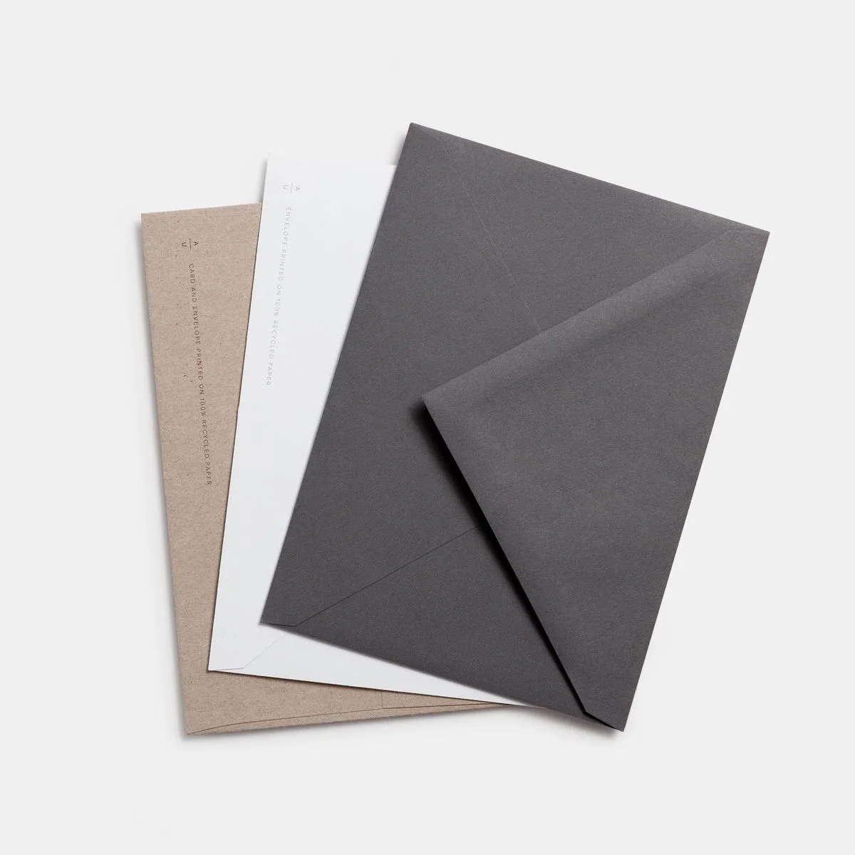 Each Thank You Card Template is a 5x7 Flat Card. Printed on Premium Matte 100% recycled paper. The envelope choices are Kraft, White, or Grey.